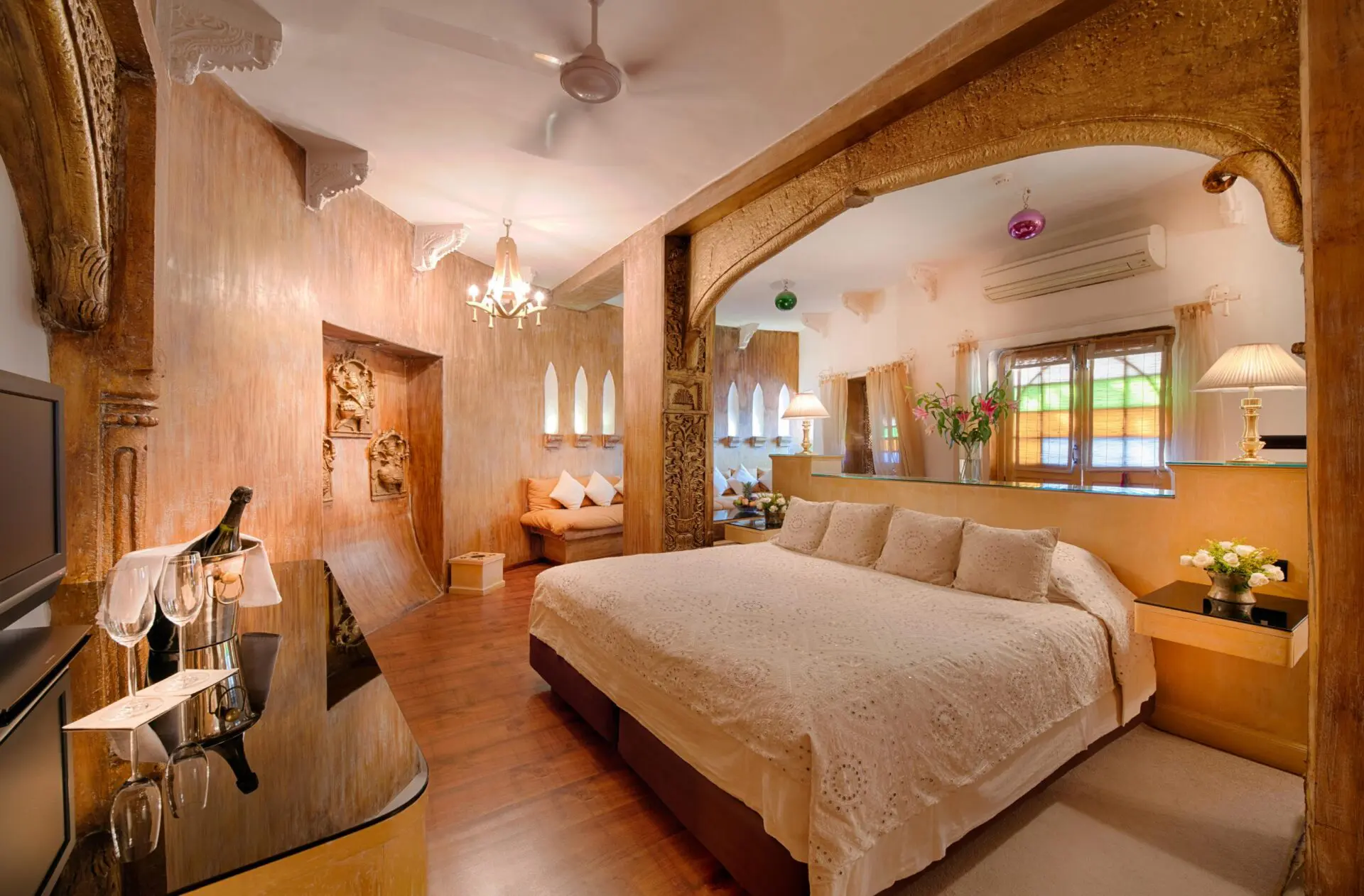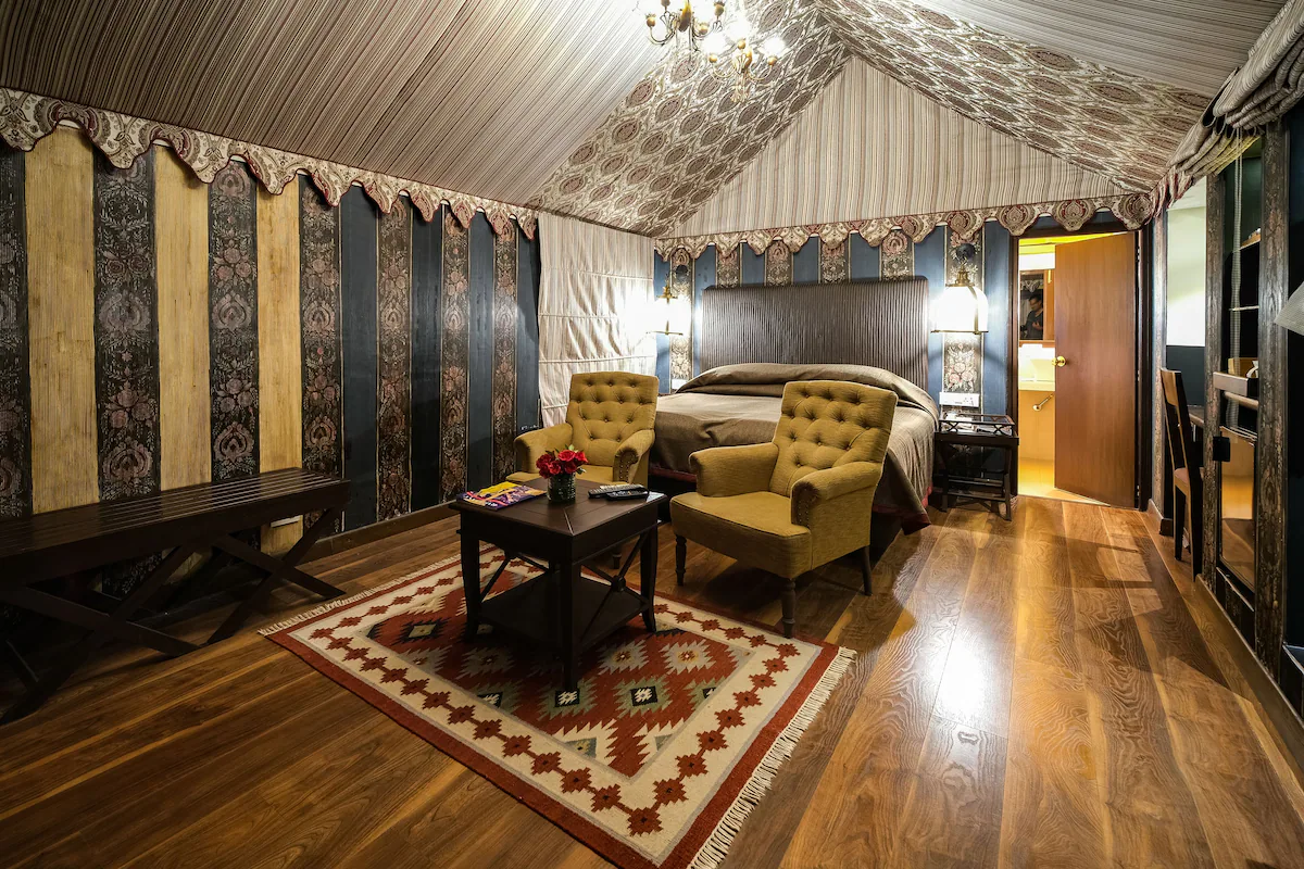 The air-conditioned rooms feature modern amenities like a flat-screen TV, tea/coffee maker, WiFi, and an electronic safety locker. For a unique experience, there are elegant rooms within tents.