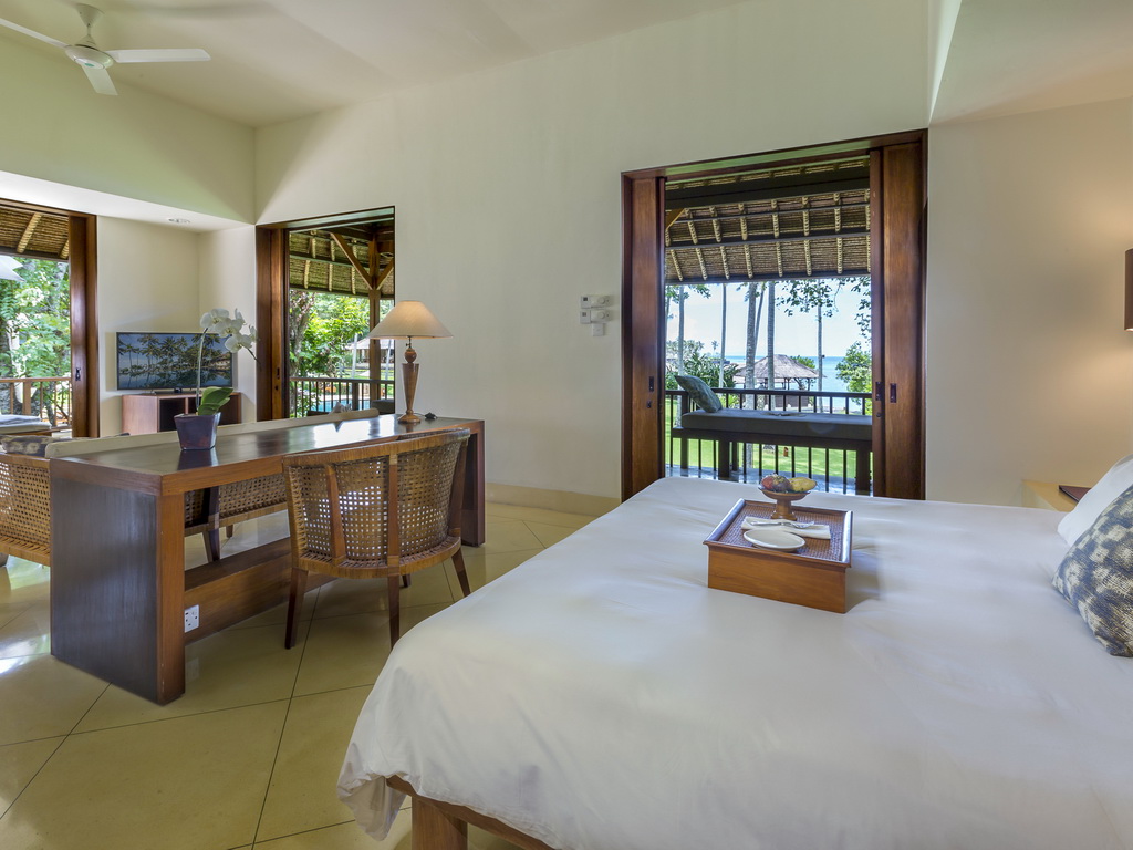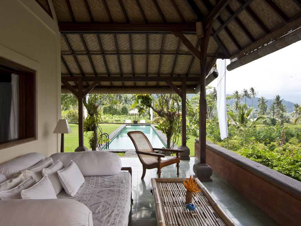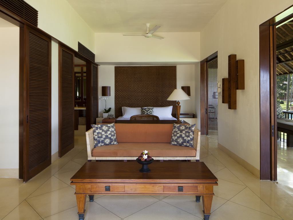 All 53 rooms and two suites are housed in traditional two-story thatched Balinese pavilions. Each room features a private terrace or a balcony with a daybed with in-room amenities, including Cable TV, an in-room safe, an IDD telephone, a mini-bar, and WiFi.