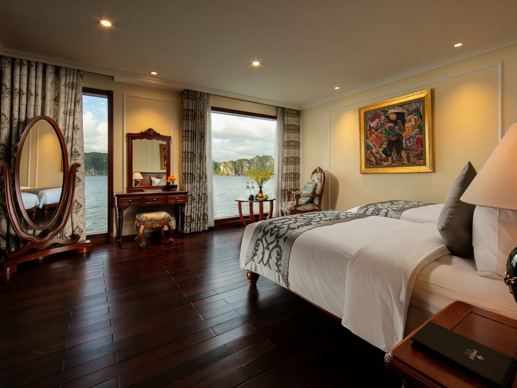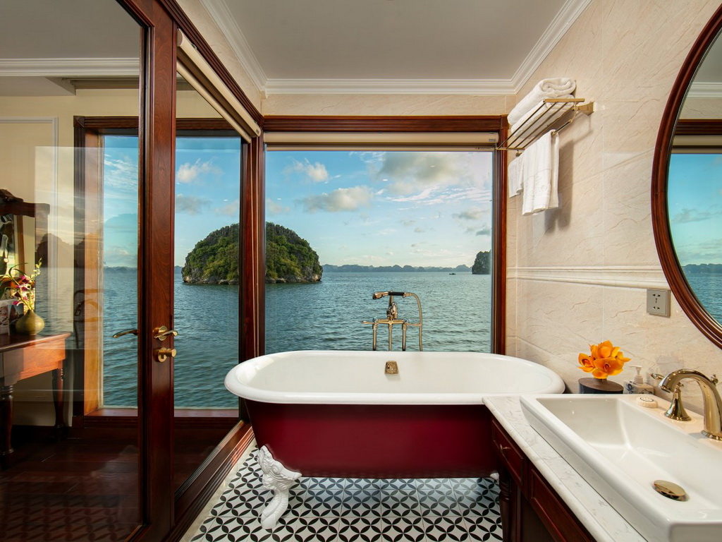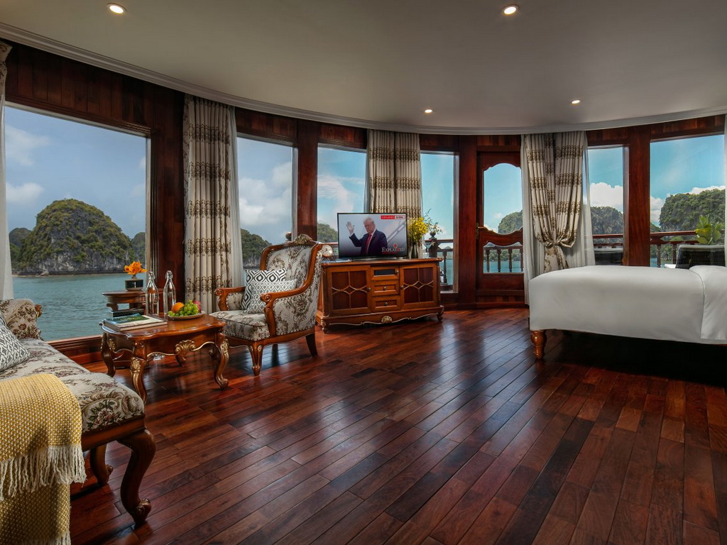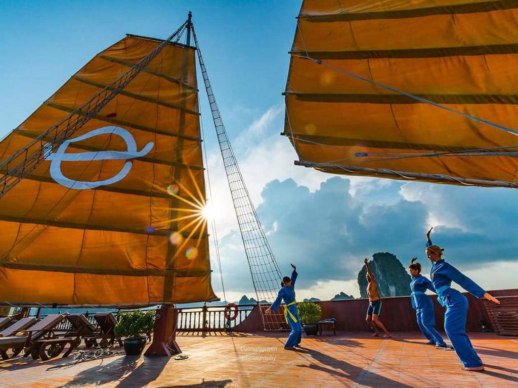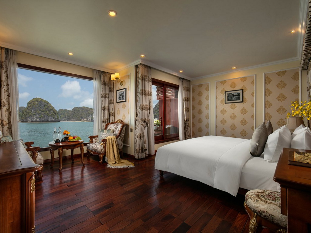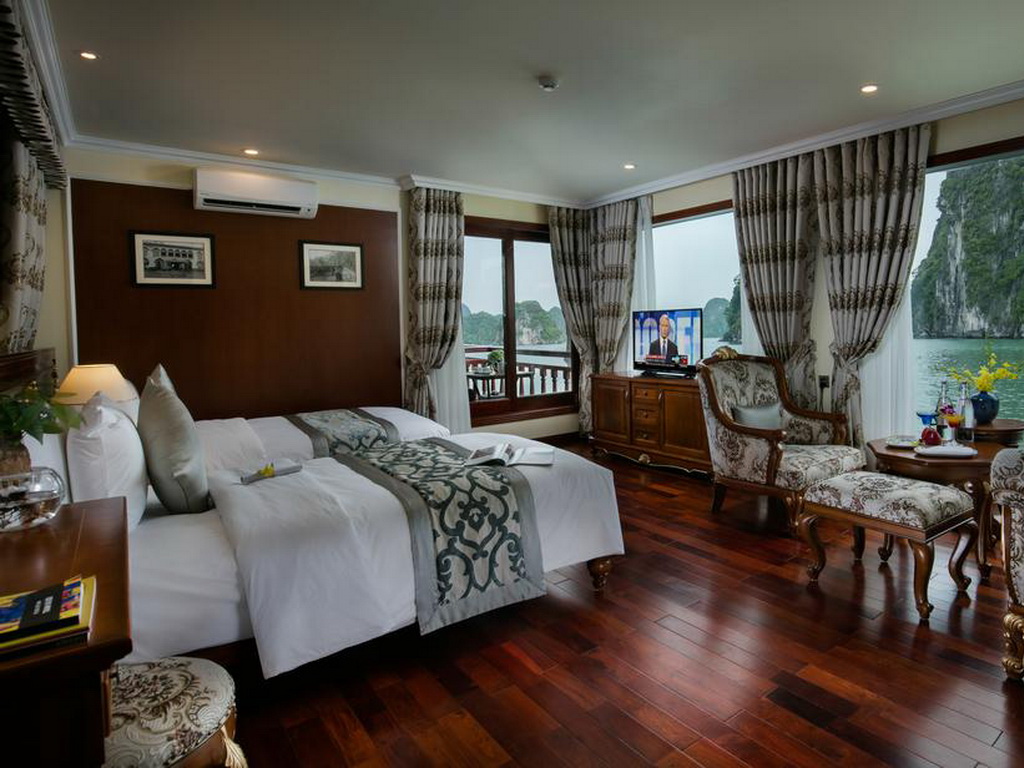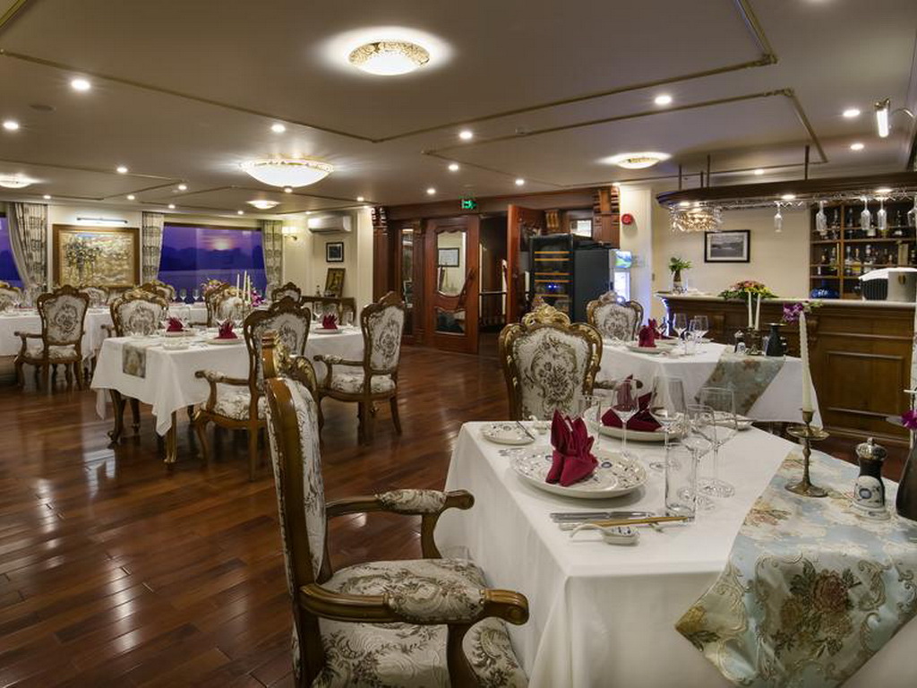 Emperor Cruises is a custom-designed traditional junk cruise that features three decks that house an open restaurant, two lounge bars and clubs, a small library, internet café, two Jacuzzis, saunas, two massage rooms, a kids’ club, and a gymnasium to service the eight luxurious en-suite cabins with ocean views and private balconies. All eight cabins are en-suites with private balconies and personal butler service. Each suite features a walk-in closet, hair dryer, in-room safe, smart TV with movies-on-demand, 24-hour room service, mini-bar and hair dryer, and in-room safe. Emperor Cruises Ha Long features a restaurant, fitness center, a bar, and shared lounge in Ha Long. This 5-star cruise offers a kids’ club, a business center, WiFi and a 24-hour front desk, room service, and currency exchange for guests.