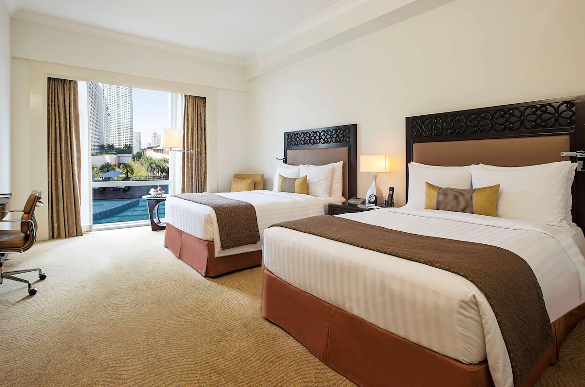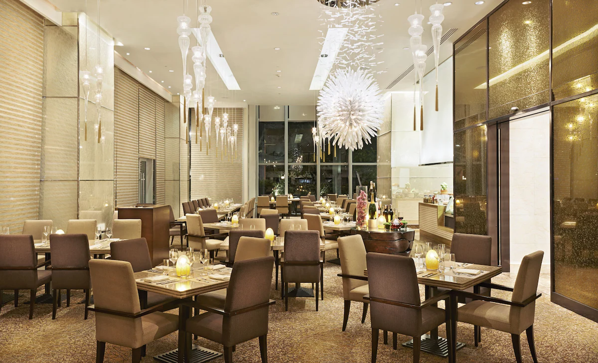 All 280 air-conditioning spacious guest rooms and suites feature floor-to-ceiling glass windows overlooking the bustling city. Each room has a flat-screen TV with cable channels, WiFi, a marble bathroom, an in-room safe, tea and coffee-making facilities, an Iron and ironing board, a mini-bar, and an alarm clock.