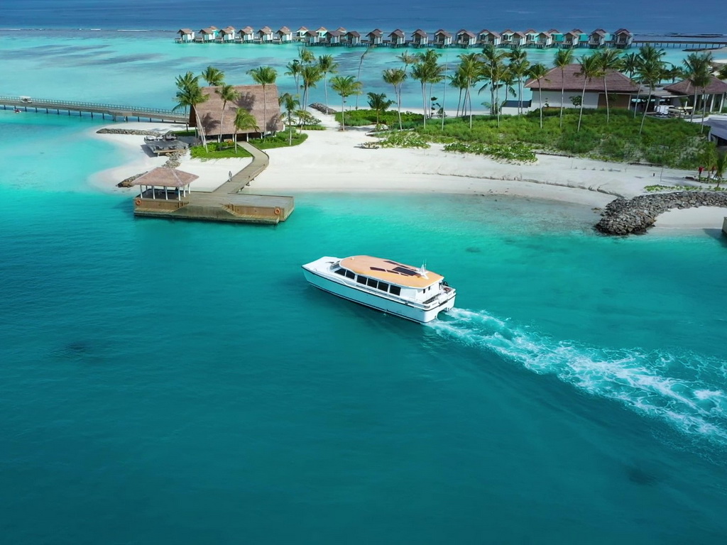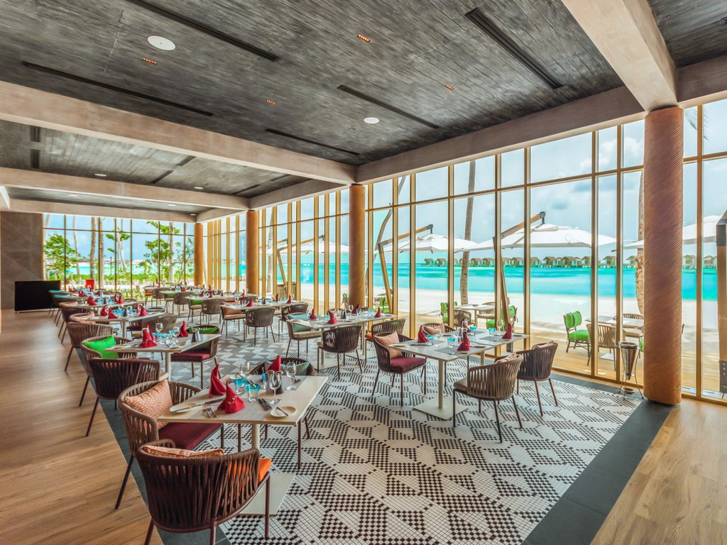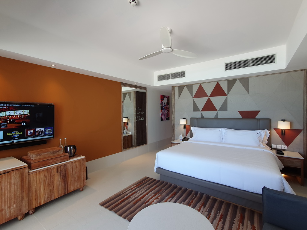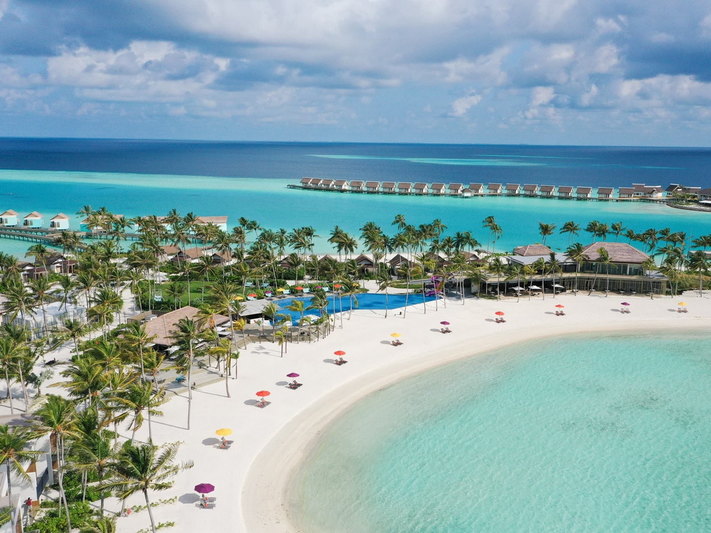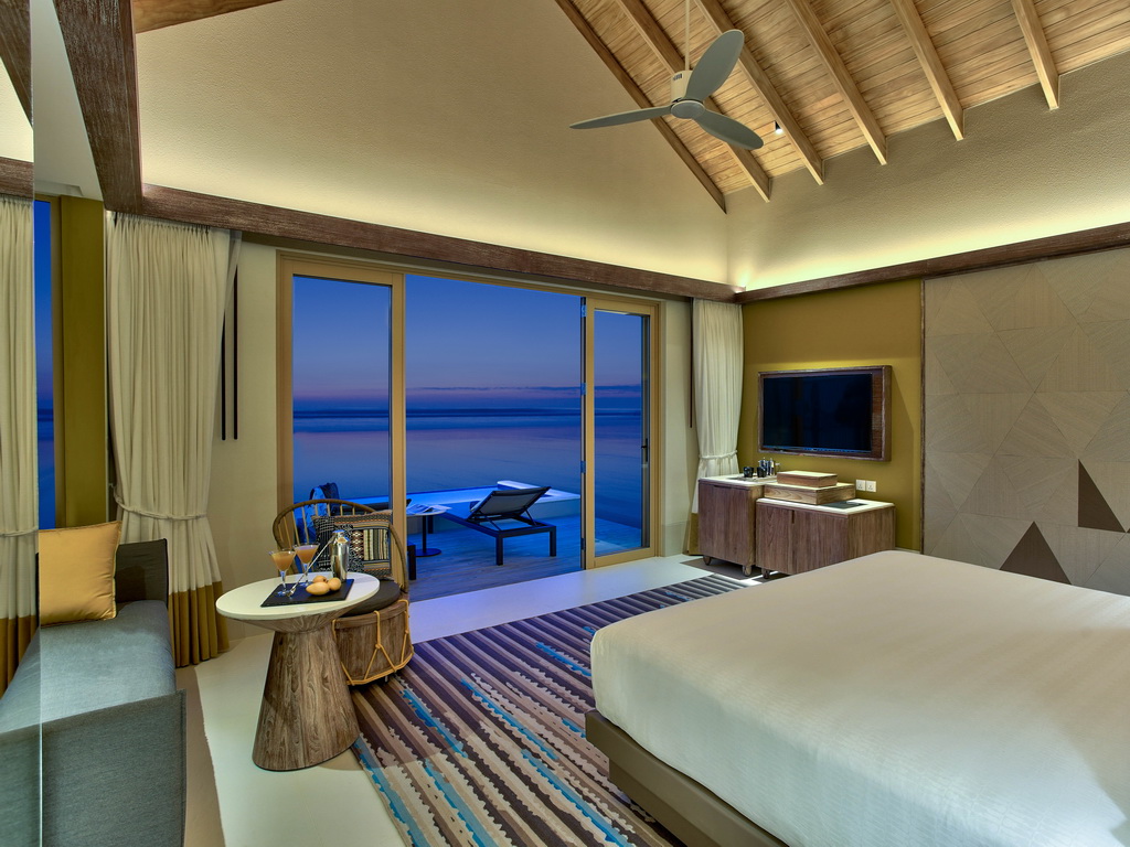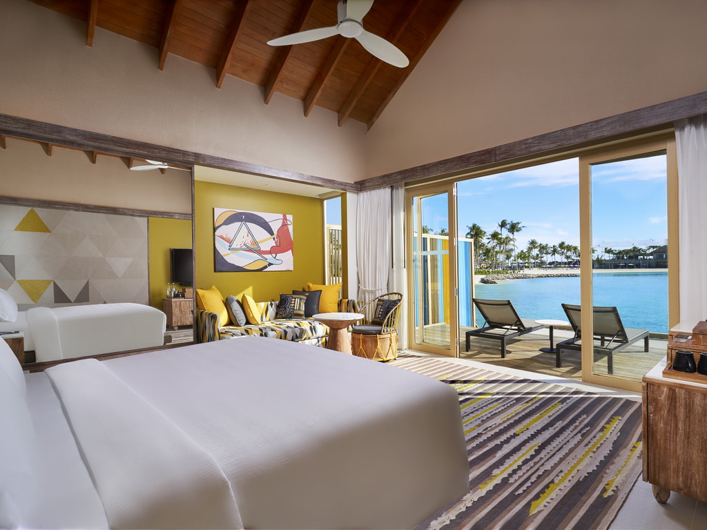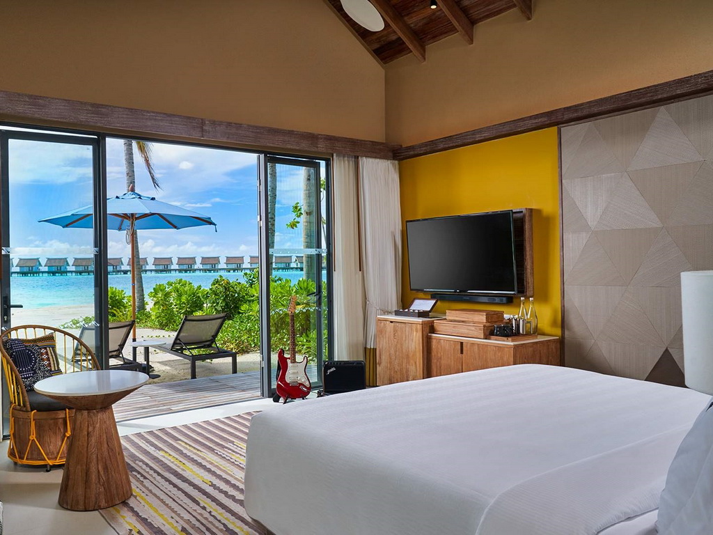 Located within Emboodhoo Lagoon in South Male’s Atoll, Hard Rock Hotel Maldives is the first integrated resort destination in the Maldives. It is a 20-minute boat ride away from Velana International Airport. The resort boasts 178 spacious guestrooms, including family suites, beach villas, and one and two-bedroom overwater villas, exclusively on a beautiful island. Each unit features a Simmons “Cool-Max” bed with 300 threads count bed linens, a flat-screen TV with satellite channels, a soundbar, tea and coffee-making facilities, Wi-Fi, a mini-bar, an electronic safe, and an outdoor deck or balcony. Hard Rock Hotel Maldives guests can enjoy a buffet breakfast every morning at the all-day dining restaurant and treat their taste buds to delectable on-site food and beverage options, including a Pan–Latin American restaurant. The hotel features a large ocean-view swimming pool with a slide and underwater speakers, a Rock Spa, a Body Rock gym, a Rock Shop, a Hard Rock Café, and direct access to The Marina @ CROSSROADS.