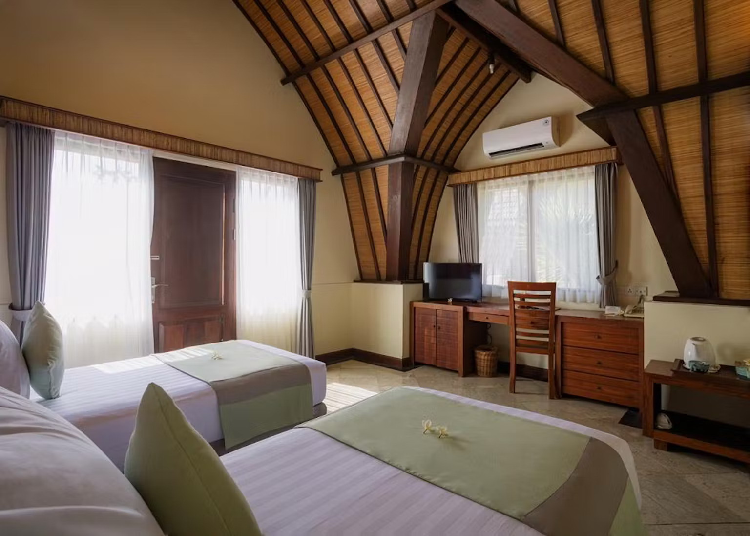 Situated 34 miles east of Bali, off Lombok's northwestern coastline, Hotel Vila Ombak offers stunning views of Mount Rinjani. This upscale beachfront hotel is just a 9-minute walk from the Gili Trawangan ferry terminal and a 13-minute walk from Sunset Point.   Inspired by Lombok architecture, Vila Ombak features elegant Indonesian-style rooms with modern interiors in tropical gardens. Each room includes a spacious terrace for sunbathing, a safe, tea and coffee-making facilities, and cable TV.   Guests can enjoy a breakfast buffet at the beachfront restaurant, which serves various local and Mediterranean dishes. Additional amenities include a private beach, two outdoor pools, a spa, a poolside bar, and Wi-Fi.