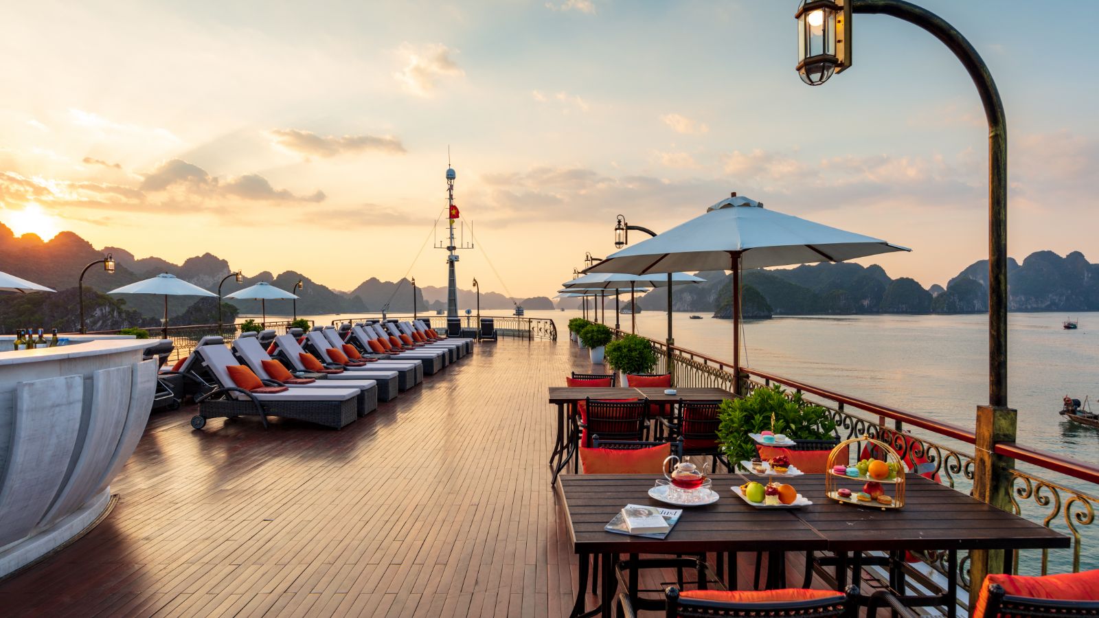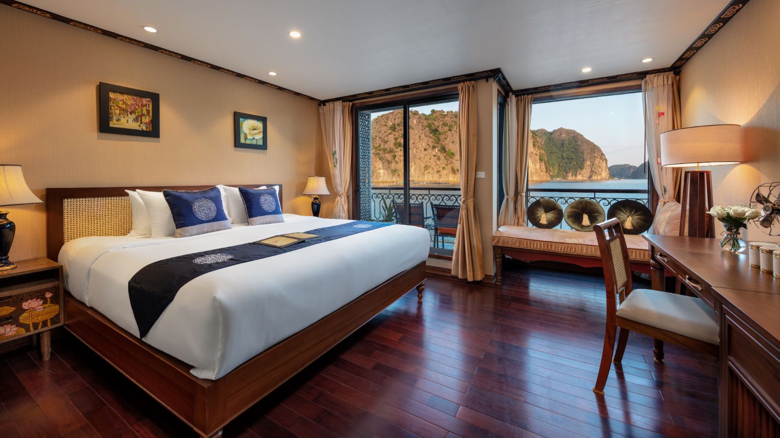 With 43 luxurious cabins divided into four categories: Junior Suite, Suite, Executive Suite, and President Suite, Indochine Lan Ha Cruise is the newest member of the Indochina Sails family. All cabins feature high windows, private balconies, a double bed or two single beds, and wonderful wall décor evoking Vietnam's colonial period. It has an en suite bathroom with a rainfall and massage shower. The ship is 249 feet long, 47 feet wide, and 11.8 feet deep. There are two restaurants, a lounge, and a bar serving international and local cuisine. A sundeck, a gym, a Jacuzzi, a spa, and a massage service are also available.