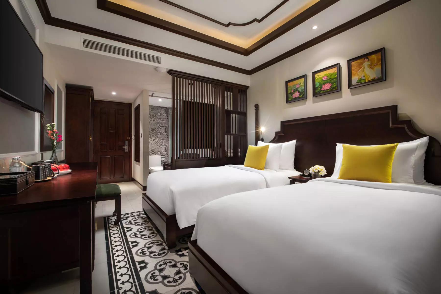 Mulberry Collection Silk Village is divided into the Charm and the new Trendy Wing, boasting 131 spacious guest rooms, suites, and villas, offering a harmonious blend of traditional charm and contemporary elegance. Each accommodation option is thoughtfully appointed with modern comforts, including a 40" LED TV, a minibar, an in-room safe, luxurious bathrooms with premium amenities, cozy seating areas featuring armchairs and coffee tables, and private balconies offering serene views.
