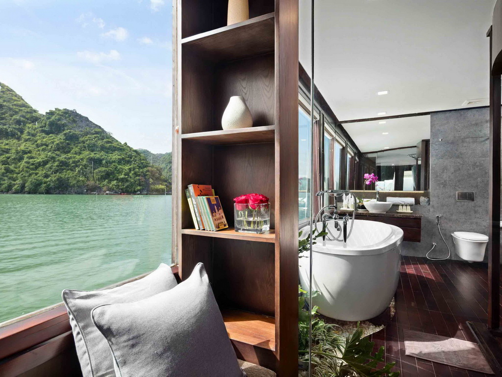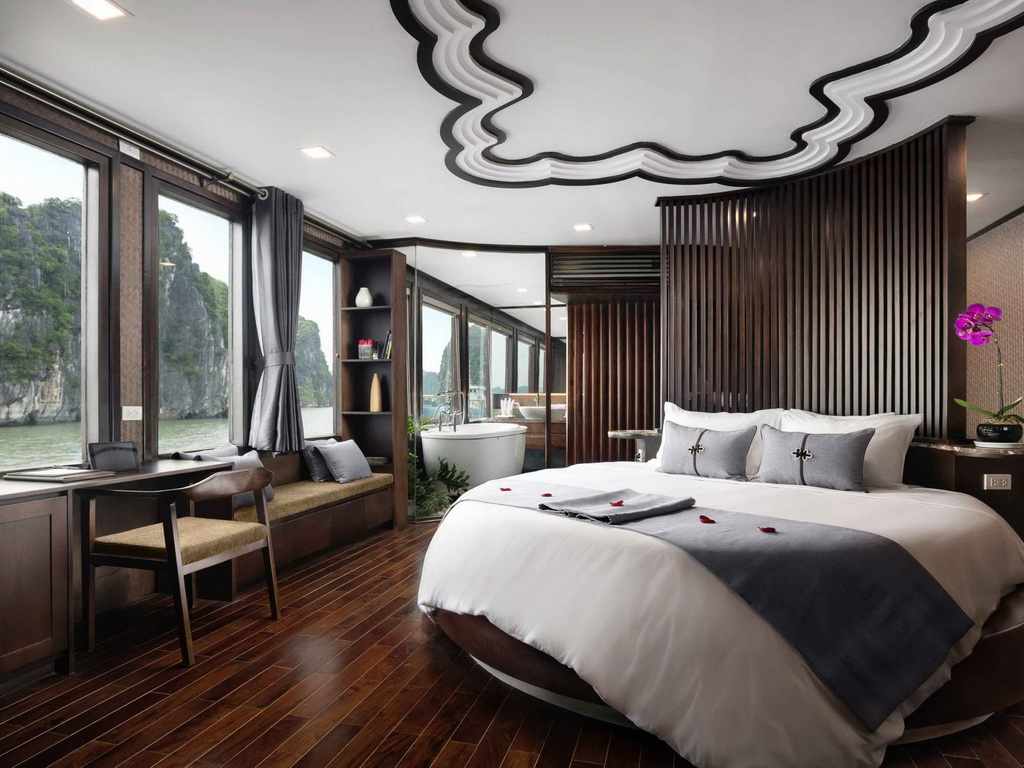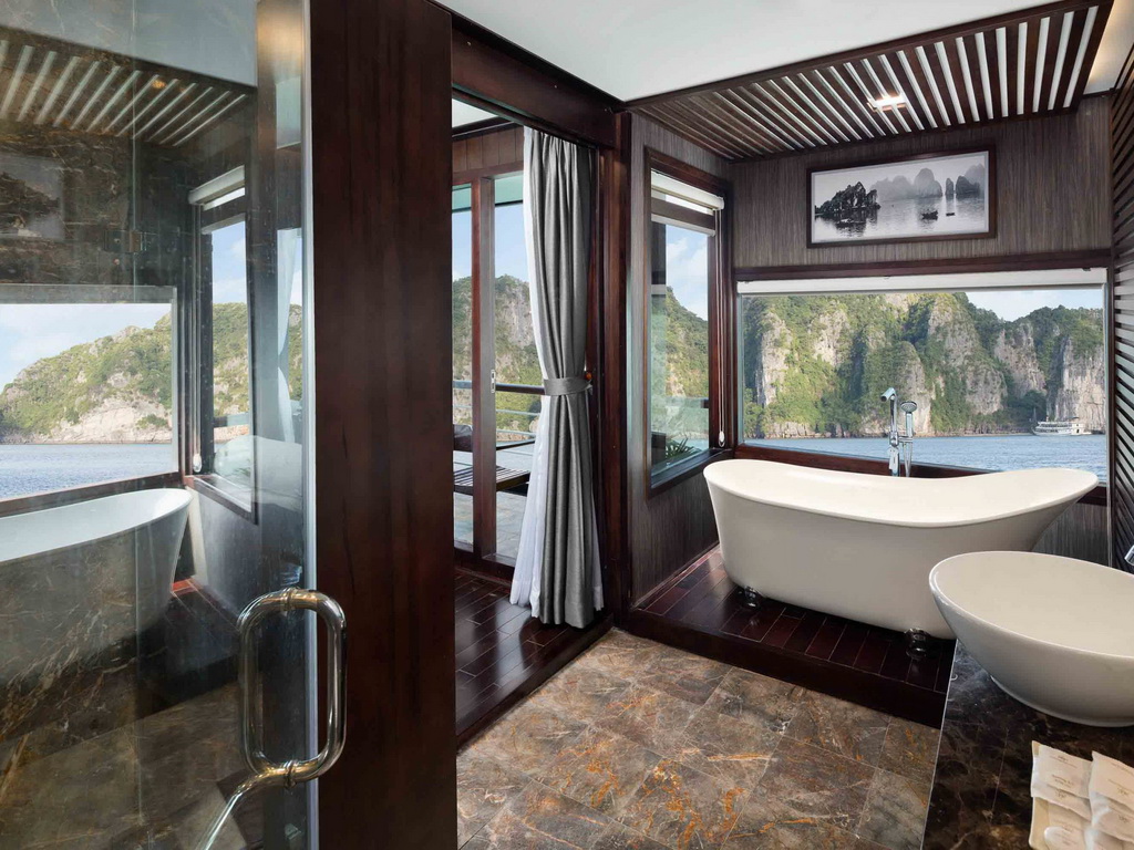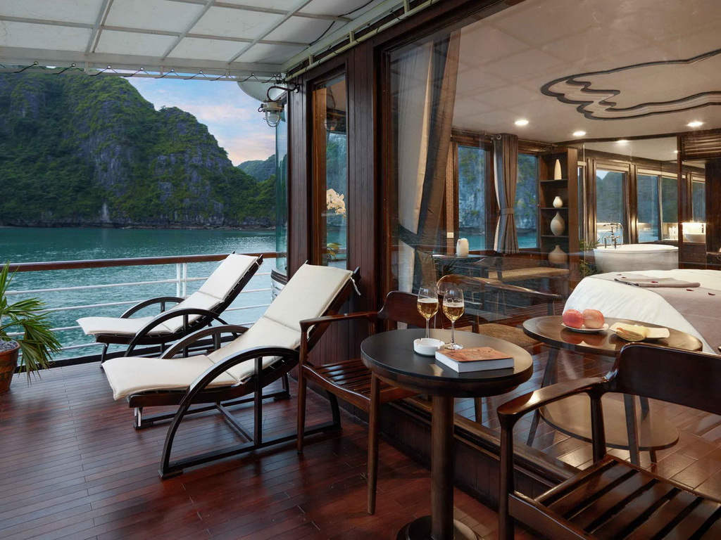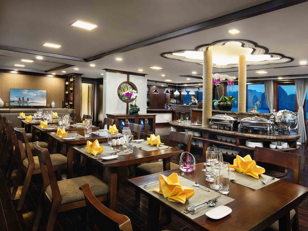 Featuring a sun terrace, the Orchid Ha Long Cruise offers an itinerary of cruising along Halong Bay and Lan Ha Bay. Orchid Classic Cruises houses 14 luxury cabins with an elite, professional crew that will provide you with the best services during your travels in Ha Long. All 14 spacious suites with balconies and private baths overlooking the gulf, an outdoor jacuzzi on sundeck, Orchid Classic with 5-star services guarantees clients an extraordinary experience in discovering the mysterious beauty of the bays. The Orchid Cruise Restaurant on the main deck serves breakfast, lunch, and dinner. There is also a spa center that offers massages and facials. Activities and excursions include cooking classes, tai chi lessons, kayaking, and squid fishing.