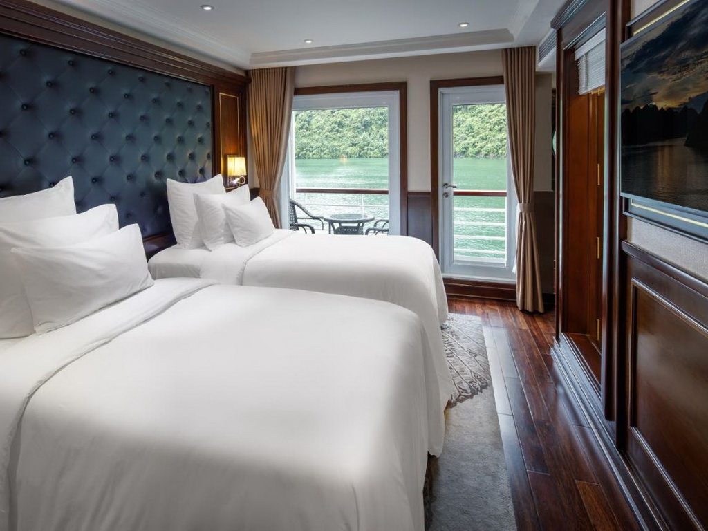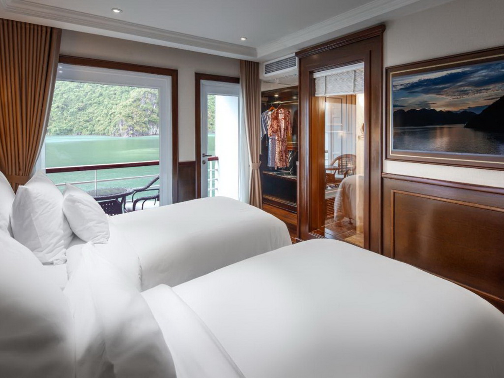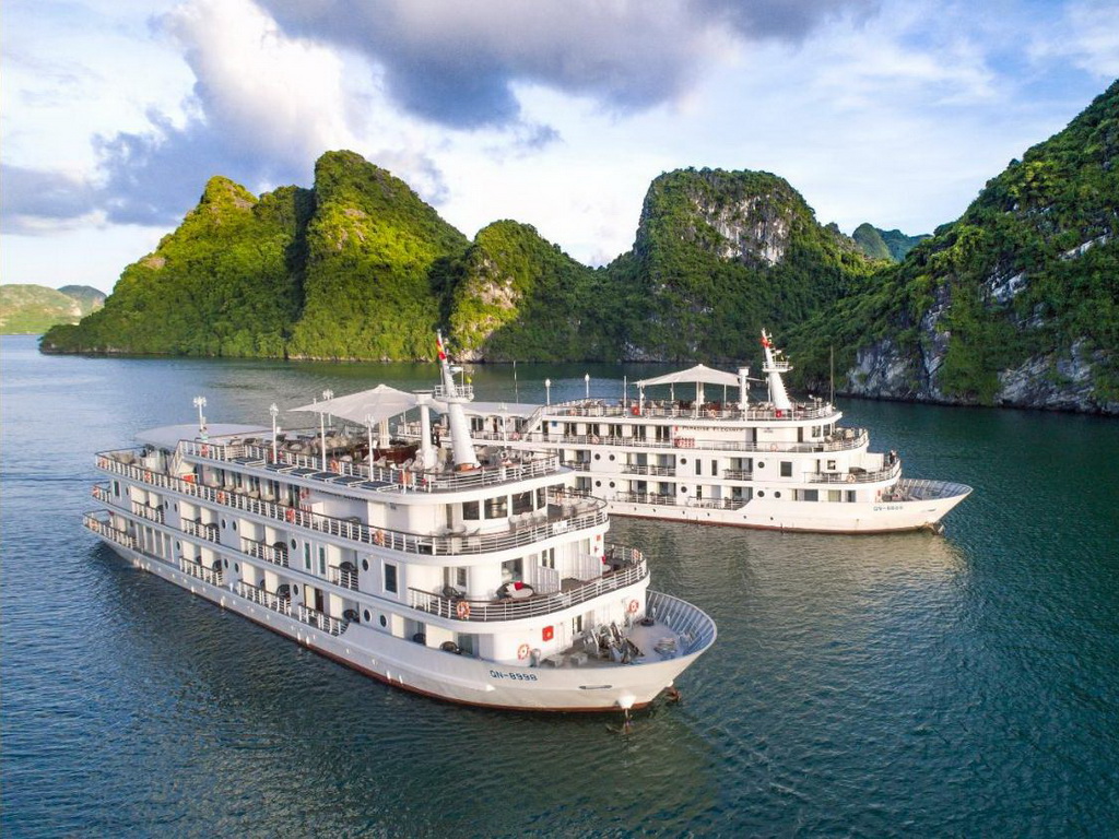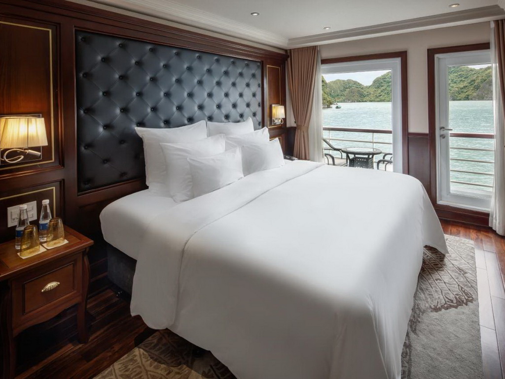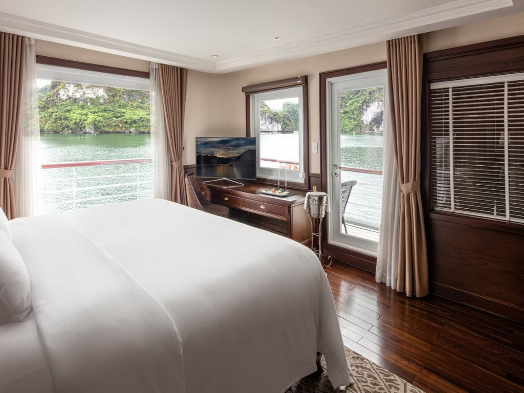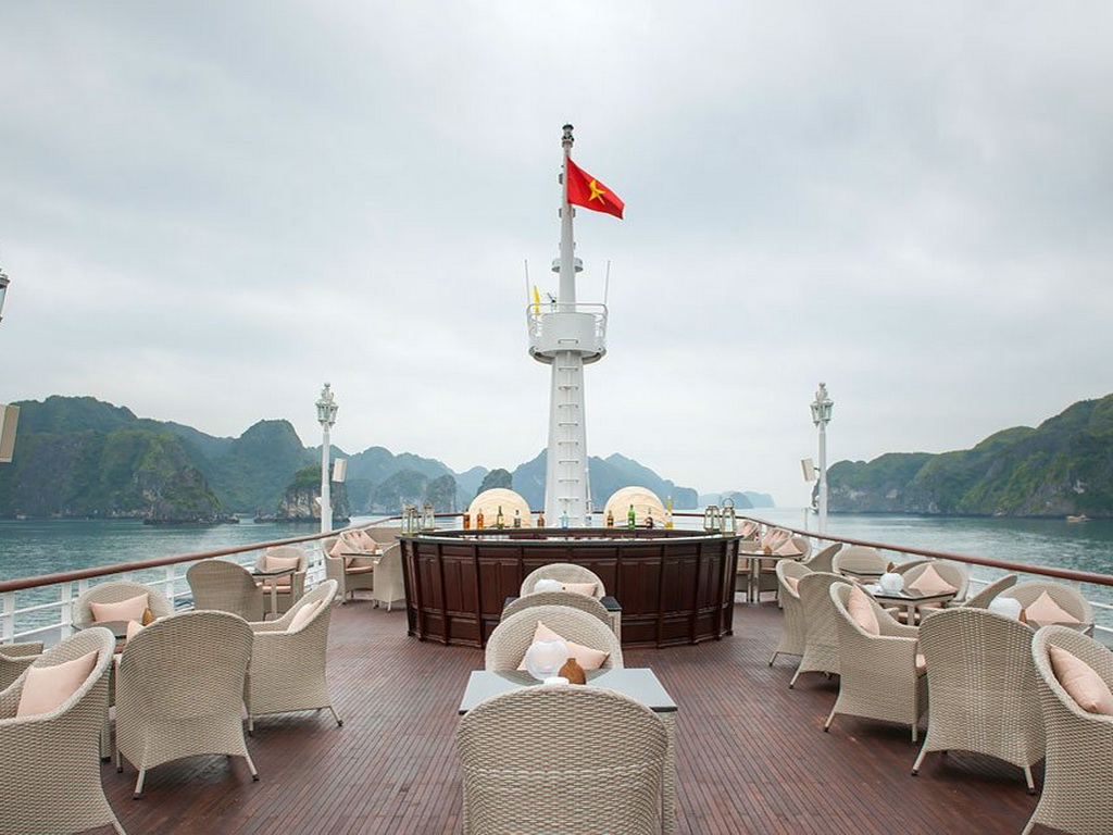 Paradise Elegance is an impressive escape to Halong Bay. A meticulously-designed steel boat boasts grandeur architecture and classical interiors, inspiring travelers to explore the natural heritage and its mysteries beyond. Fusing contemporary style with traditional Vietnamese concepts, mixing basic materials such as metal and wood makes the Paradise Elegance a stunning work of art, berthed magnificently in the middle of the world wonder Halong Bay. The Paradise Elegance has 14 Deluxe Balcony Cabin, 13 Executive Balcony Cabin, 2 Captain’s View Terrace Suites, and 2 Elegance Balcony Suites. All cabins feature a central air-conditioner, en-suite bathroom, hair-dryer, toilet, complimentary toiletries, cabinet, personal safety box, complimentary mineral water, slippers, wardrobe, and life jacket. It also has a massage room, a library, dining room, bar, and sundeck.