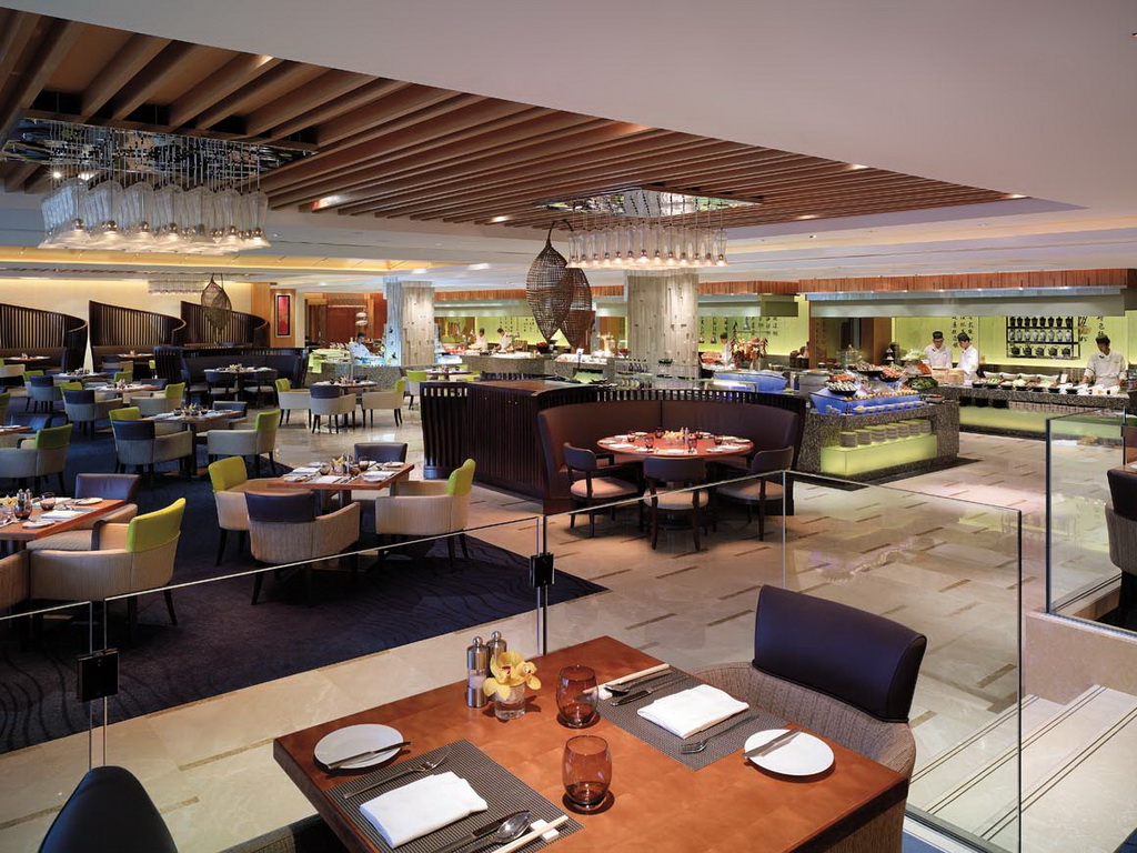 Li Café serves international and local cuisine. The Shang Palace on level 2 serves Cantonese, Huaiyang, Hunan, and Guilin cuisine. The U Bar on level 1 offers a western menu with a wide selection of wines. The Lobby Lounge on level 1 serves snacks and beverages, and the Pool Bar serves poolside snacks and drinks.