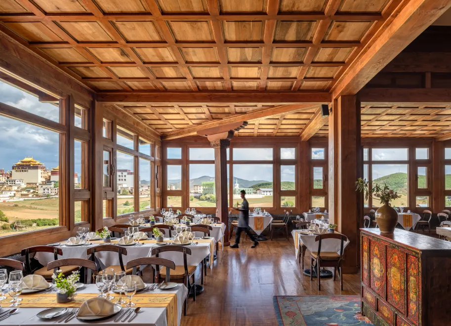 Indulge your palate at the hotel's two distinctive restaurants – the first-floor Tibetan restaurant in the main building showcases authentic Tibetan dishes. In contrast, the second-floor all-day restaurant offers a diverse selection of international cuisine. The bar, boasting panoramic views of the Songzanlin Temple, invites guests to savor a wide array of beverages.