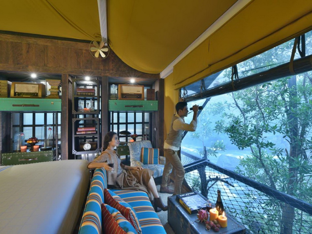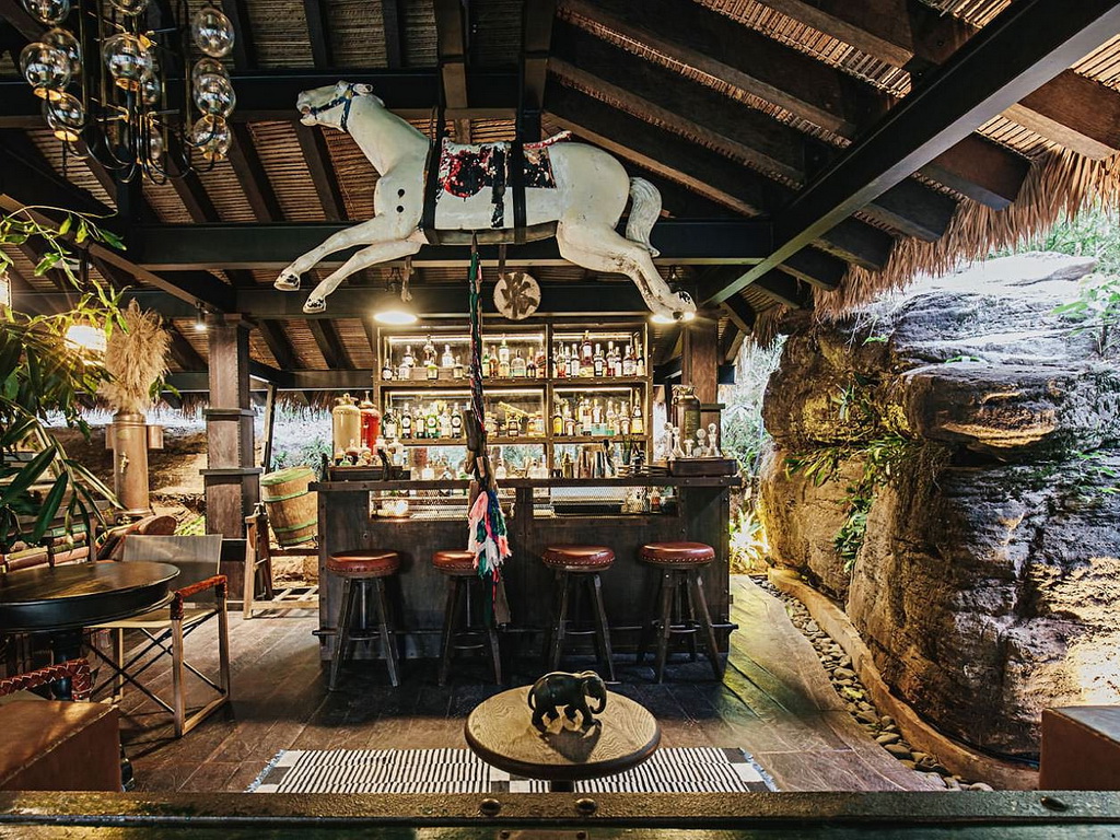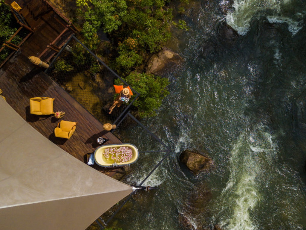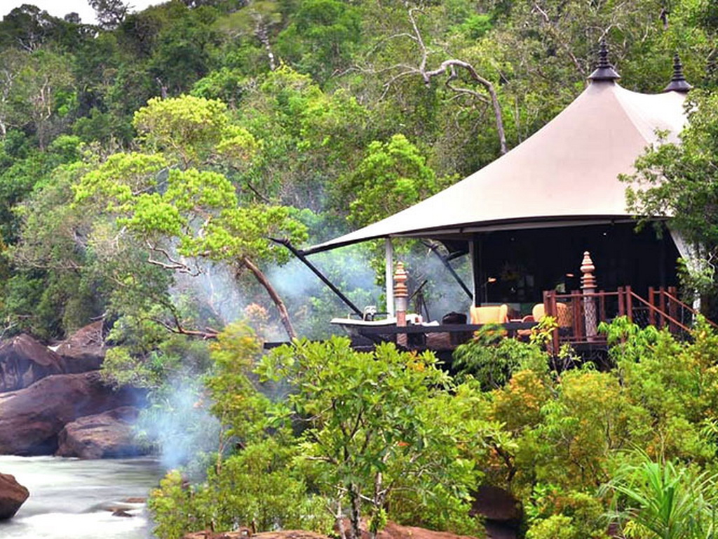 Nestled in Kirirom National Park on the eastern edge of Southern Cardamom National Park, the all-inclusive Shinta Mani Wild luxury camp sits in an 865-acre private nature sanctuary. The resort is about a 3-hour drive from Phnom Penh and Sihanoukville. Each of the 15 luxurious custom-designed tents is perched over the swift-moving waters and waterfalls, providing a view and experience unlike any other resort in Asia. Each tent features an extra-large king-size bed made of hardwood, double vanity, an enclosed shower, a toilet cubicle, and a large outdoor deck with a living area and standalone bathtub. Meals are served either in your tent or in the Waterfall Restaurant. The Landing Zone bar is the perfect place to mingle with other resort guests and unwind after a day of trekking in the jungle. The resort also features a swimming pool and a zipline.