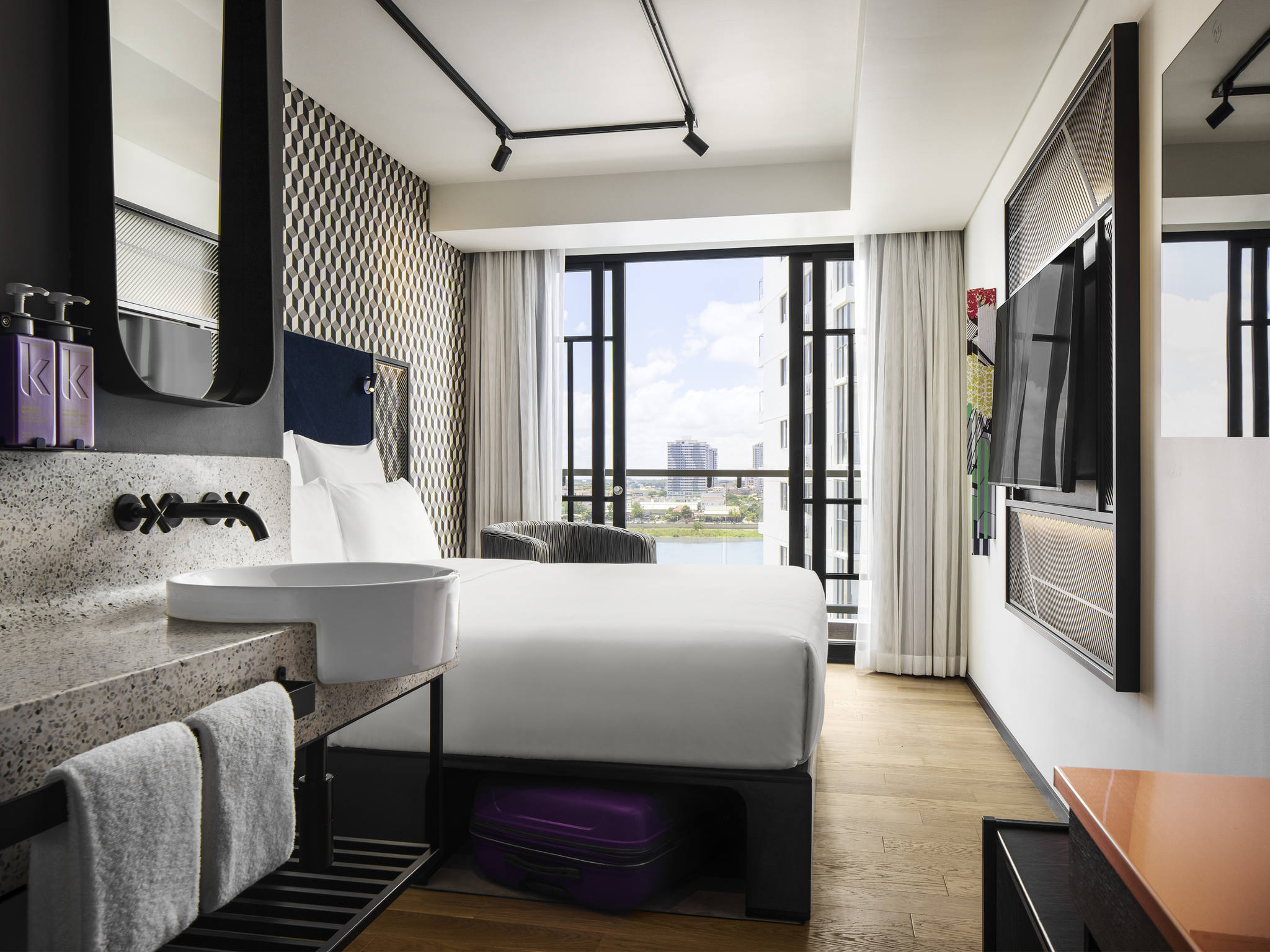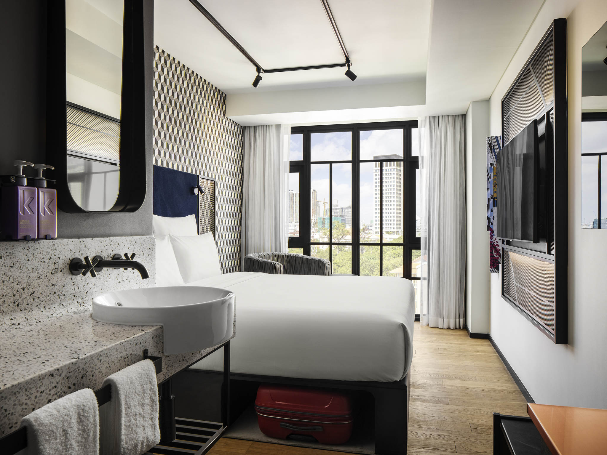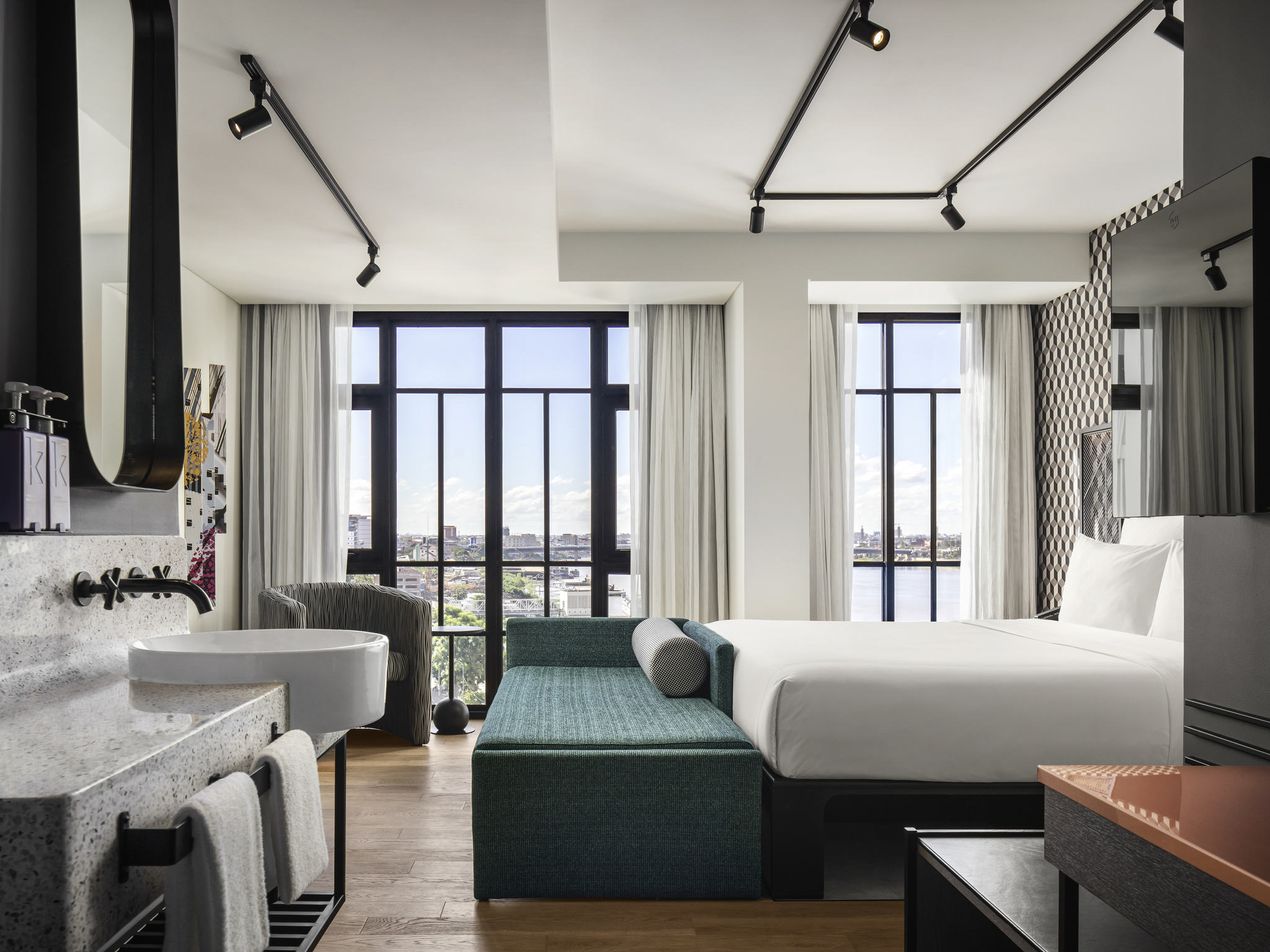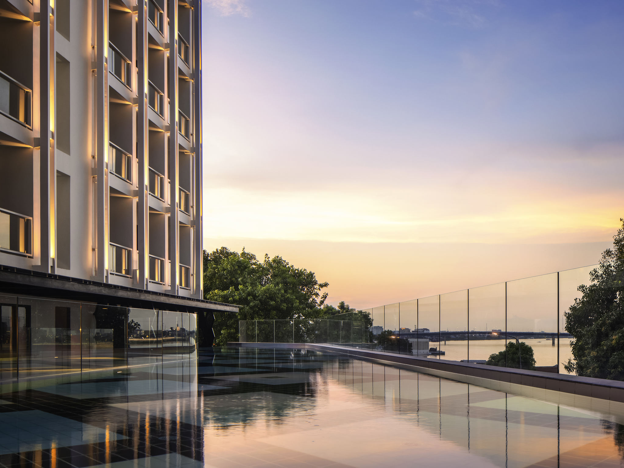 TRIBE Hotel Phnom Penh Post Office Square is a relaxed, contemporary hotel on a charming, tree-lined street, just a 2-minute walk from the vibrant bars and restaurants along the Mekong River and 1.2 miles from the iconic Royal Palace. The hotel is conveniently located about an hour from Phnom Penh International Airport.   The hotel boasts 247 smartly designed rooms, each air-conditioned and featuring a closet, coffee machine, fridge, safe deposit box, and flat-screen TV. The private bathrooms are equipped with a bidet. Some rooms also offer a balcony with city views and an electric teapot for convenience.   Guests can enjoy international cuisine at the chic rooftop restaurant, which offers stunning river and city views. The hotel also features two bars, a poolside option, and amenities like a gym and an infinity pool overlooking the river. Breakfast and airport shuttle services are available to ensure a comfortable stay.